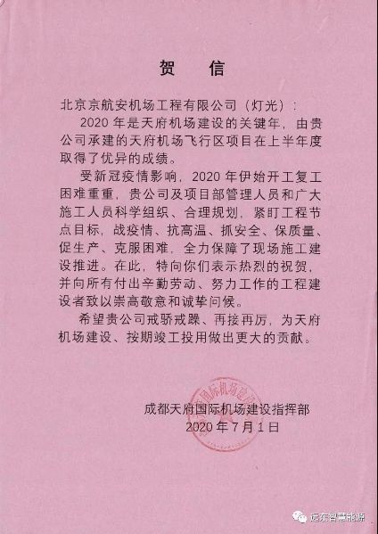 "2020 is a critical year for the construction of Tianfu Airport, and the Tianfu Airport airfield project undertaken by your company has achieved outstanding results in the first half of the year.